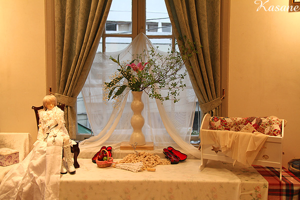 会場時間の9時半から会場の準備を始め、お昼過ぎにはドールの準備が整い、15時前にはお花の準備も整いまして・・・会場のディスプレイも整いつつあります。 ←気分次第でいろいろと入れ替わります。