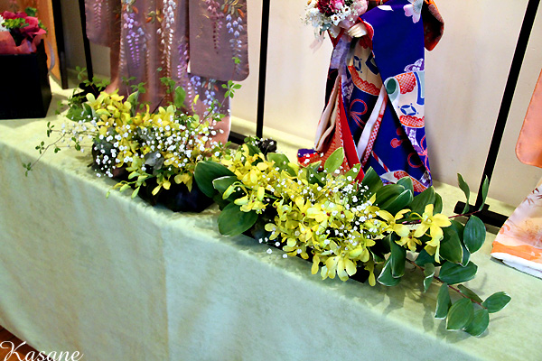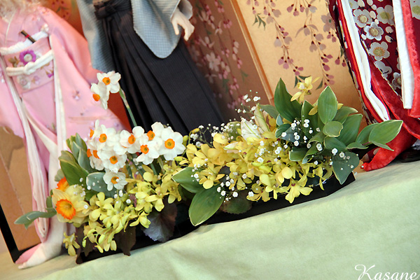 Kさまのお着物を目立たせるため、全体的に背丈は低めに生けてみました。