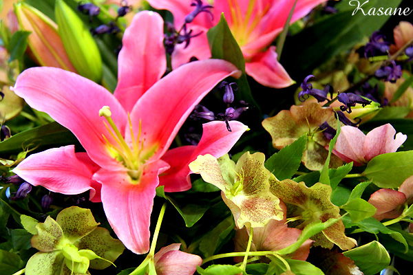 大輪の百合とグリーン、談合坂のPAで見つけたクリスマスローズとヒヤシンスで、背丈を低めに。